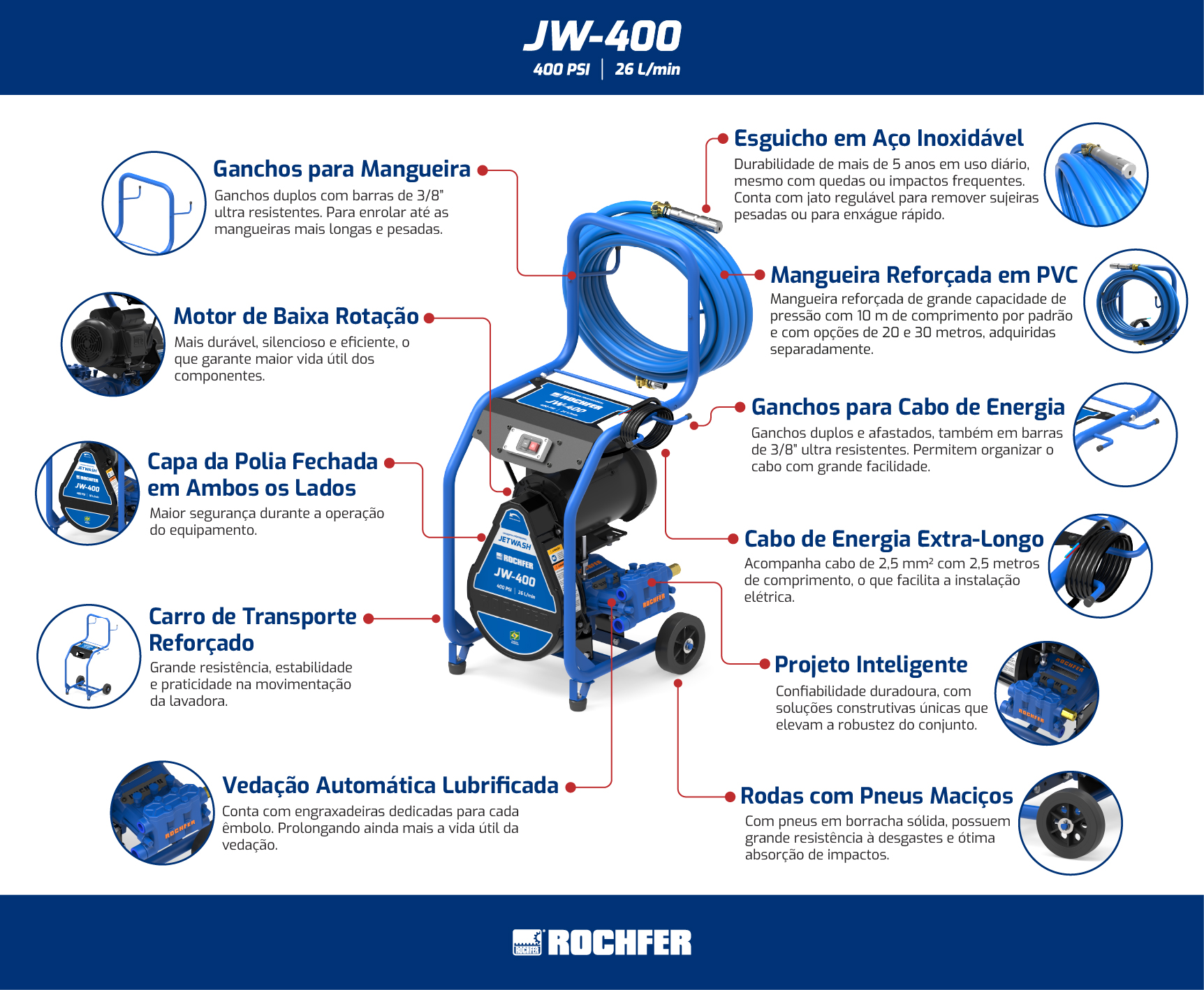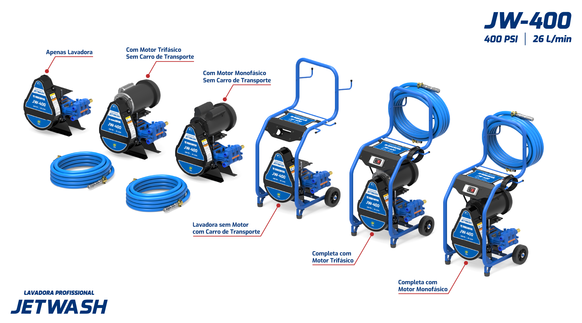 Todas as lavadoras da linha JETWASH acompanham cabo de energia de 2,5 metros como item de série, proporcionando alcance adequado e facilidade de instalação em diferentes ambientes de trabalho.